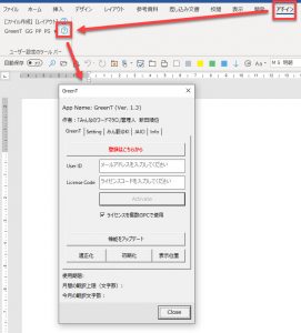 [アドイン]タブのGreenTの[?]ボタンからダイアログを表示します。