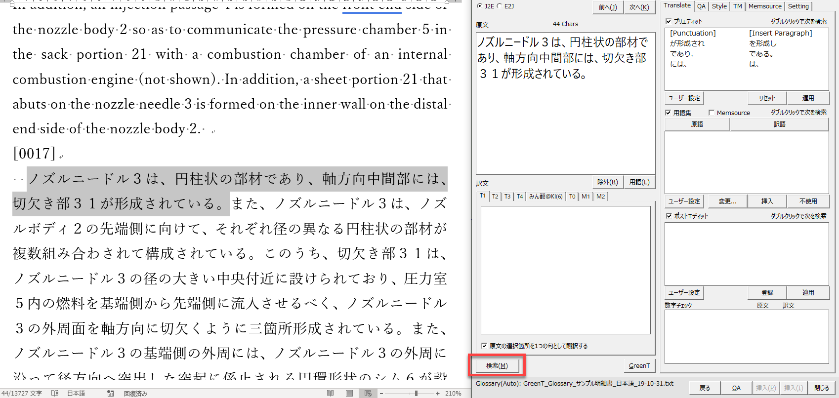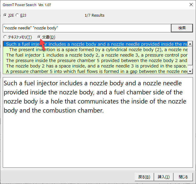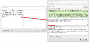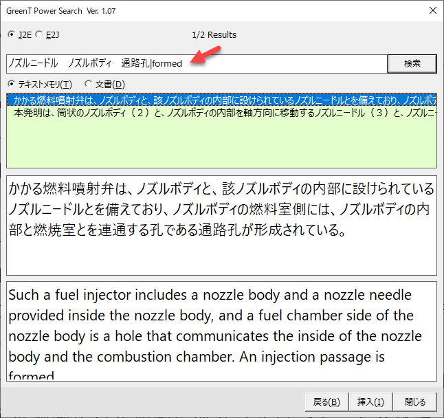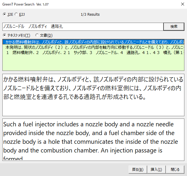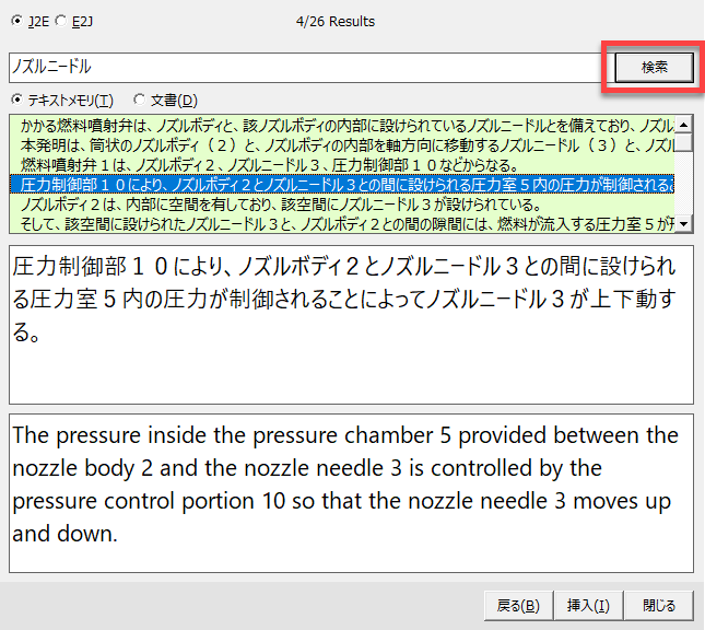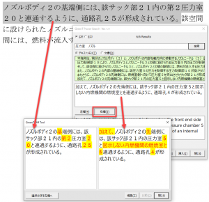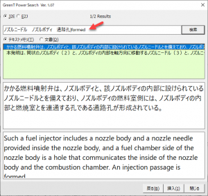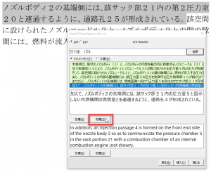 以下、日英翻訳の例です。検索キーワードを「ノズルニードル、ノズルボディ、通路孔」とした結果です。複数の検索キーワードで絞り込みができます。