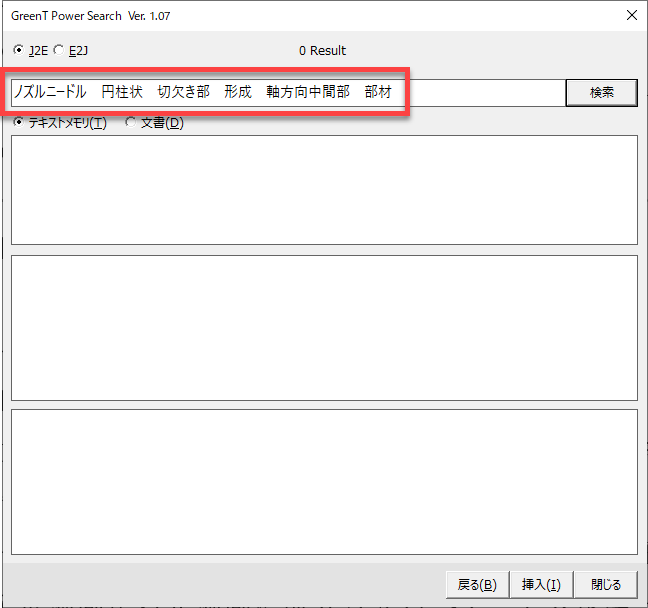 なお、ダイアログから[検索]ボタンではなく[Alt] +[F]のショートカットキーでも起動できます。この場合には、[原文]欄から用語を抽出しません。新たな検索が必要な場合にお試しください。