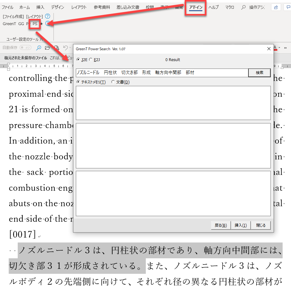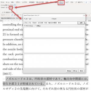 Wordファイルからは[アドイン]タブの[PS]ボタンをクリックします。現在選択されている文章中の用語が抽出され、その検索結果が表示されます。