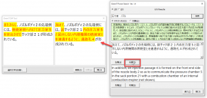 GreenTではテキストメモリ機能を使うと翻訳結果が自動的にテキストファイルに保存されます。このファイル内の翻訳結果を検索して、現在取り組んでいる訳文の候補を探します。