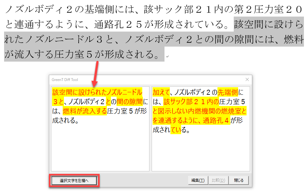 この状態で[選択文字を左欄へ]ボタンをクリックすると、以下のように文字列が表示されて比較結果が表示されます。
