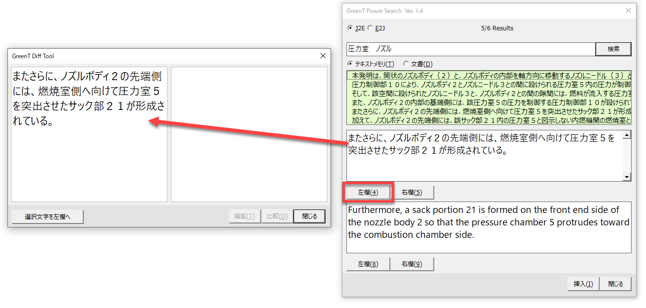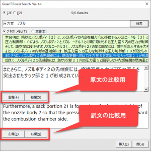 [Power Search]ダイアログの訳文欄の下にある[左欄]ボタンや[右欄]ボタンも、上記と同様に訳文同士を比較する際にご利用ください。