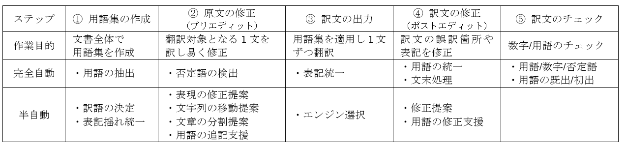 これらを踏まえ、出力された訳文を修正(ポストエディット)し最後にチェックする手順となっています。