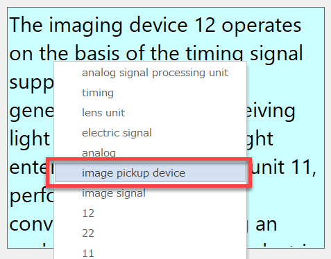 訳語は「image pickup device」ですから、これをマウスで選択するか、[↑]や[↓]のキーで選択して[Enter]キーを押します。すると選択した文字列が入力されます。