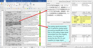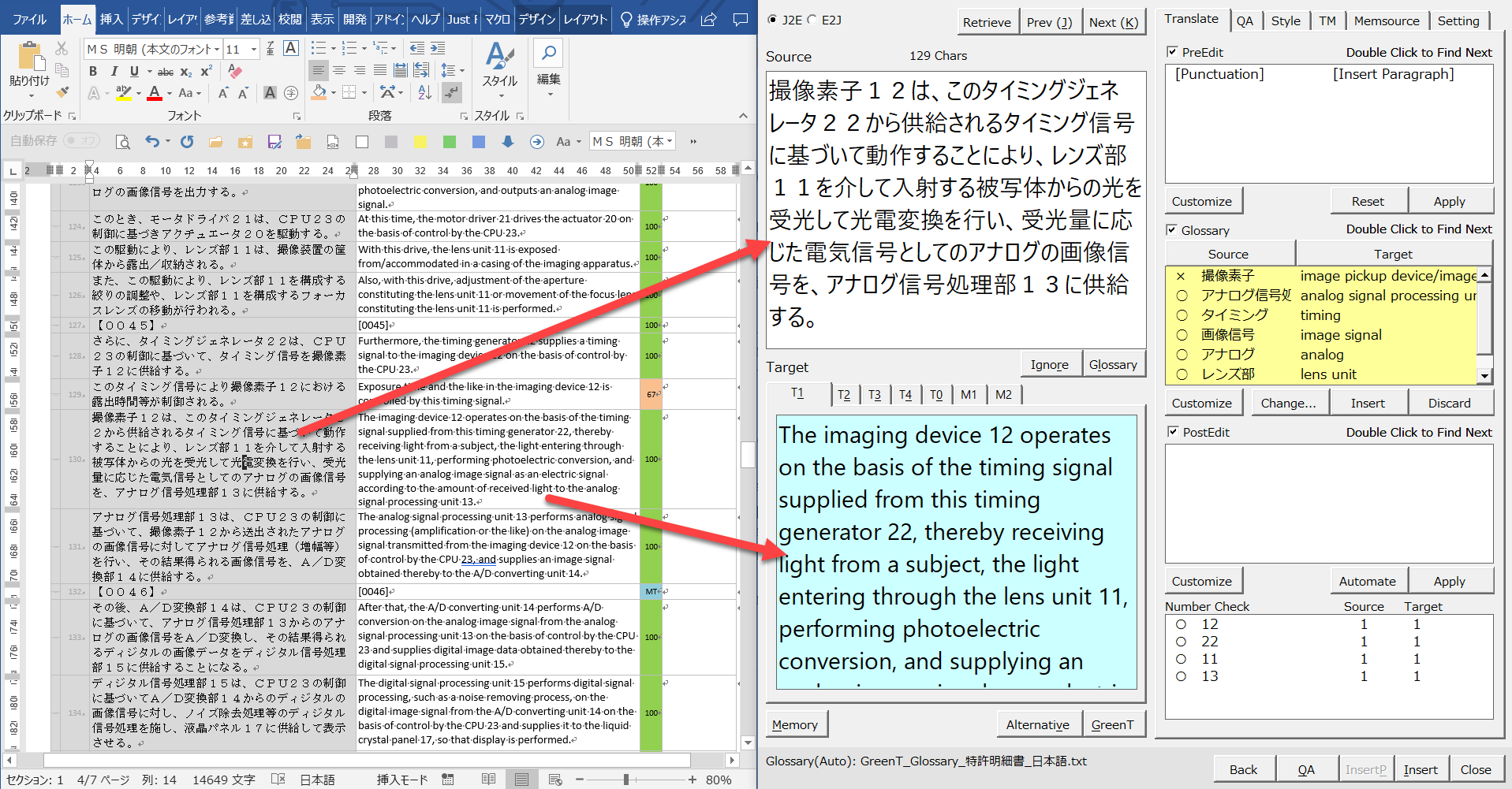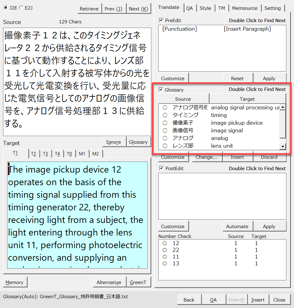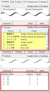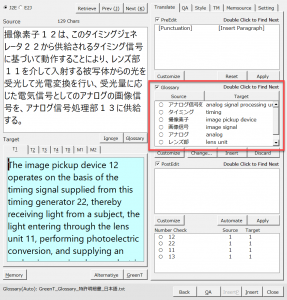 用語チェックと数字チェックの結果が以下のようになっています。「撮像素子」の訳語が間違っていると指摘されています。