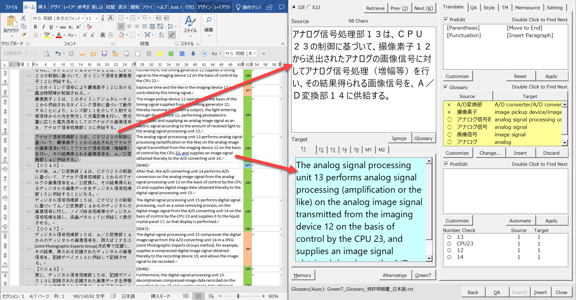 また、ずっと先の文章を修正する場合には、Word上で対象となる原文のセルにカーソルをおいてから[Alt]+[Ctrl]+[T]のショートカットキーを押したり[アドイン]タブの[GreenT]ボタンをクリックしたり、[GreenT]ダイアログの[Retrieve]ボタンをクリックしたりして文章(原文と訳文)を取得します。
