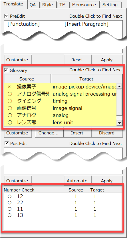また、今回はQAチェックを実行するように設定していますので、原文と訳文を取得と同時にQAチェック結果も表示されます。