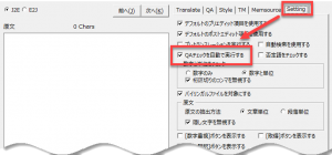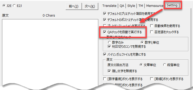 自動でQAチェックを実行するように設定しておくと便利です。訳文を出力直後やバイリンガルファイルの訳文を取得直後にQAチェックを実行できます。
