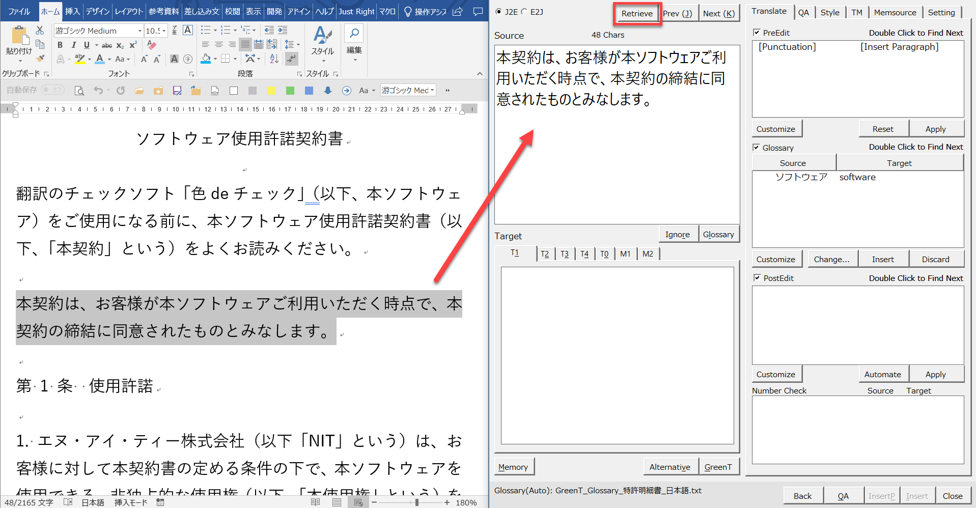 この[取得]ボタン([Retrieve]ボタン)をクリックすると文書で現在選択されている箇所の文字列を[原文]欄(Source欄)に取得できます。