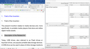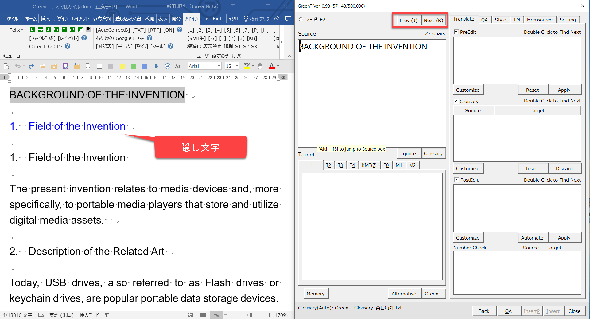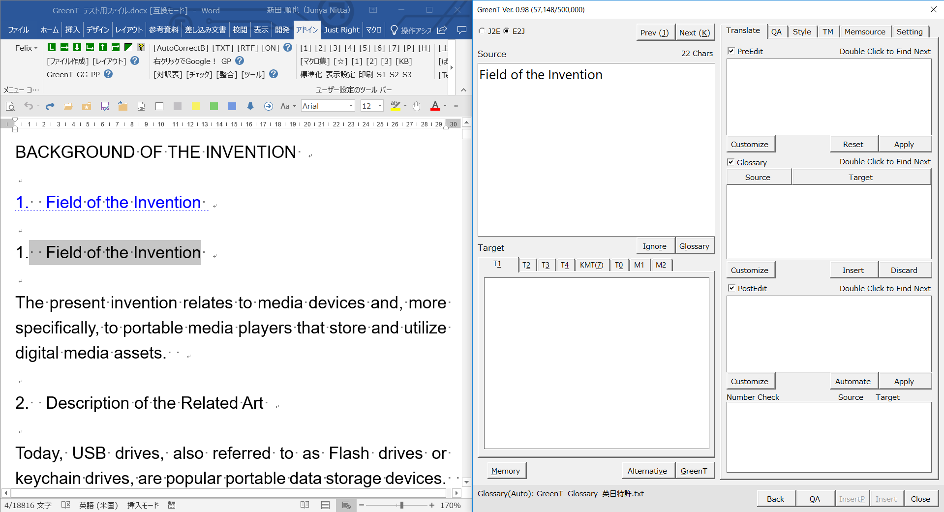 以下の例では、「Field of the Invention」が翻訳対象として選択されており、[原文]欄に「Field of the Invention」が入力されています。この状態で、Wordファイルで別の箇所「Description of the Related Art」を選択した場合を想定しています。