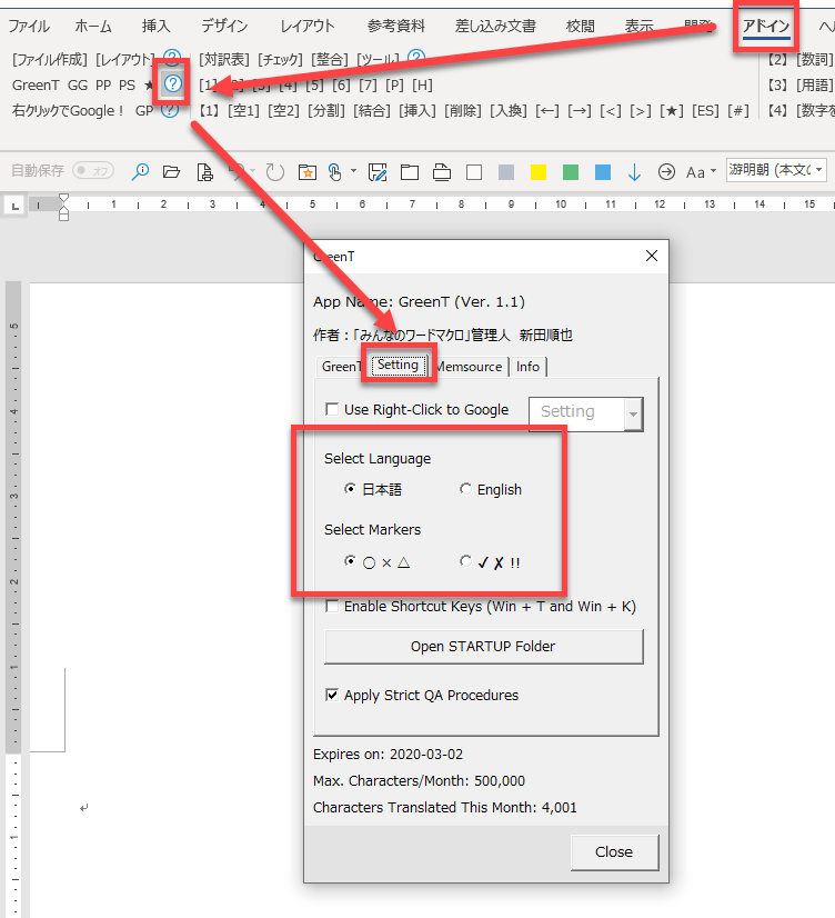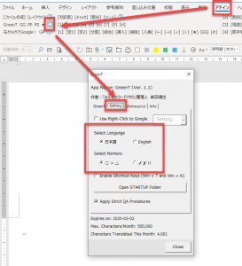 [アドイン]タブの以下のボタンからヘルプダイアログを開き、[Setting]タブを開きます。好みでお選びください。