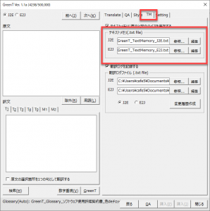 [TM]タブにある赤枠「テキストメモリ」の部分で設定をします。デフォルトで保存用のテキストファイルが用意されていますが、タブ区切りのあらゆるファイルを保存用・検索用ファイルとして利用できます。