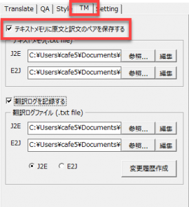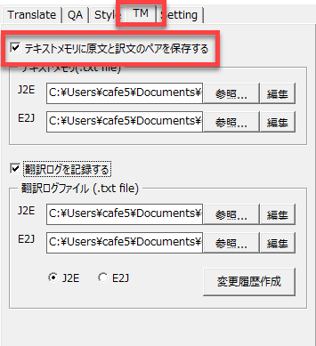 以下のチェックをオンにした場合、翻訳をして[挿入(I)]ボタンか[挿入(P)]ボタンをクリックするたびにそのときに挿入した「原文」と「訳文」がテキストファイルに保存されます。