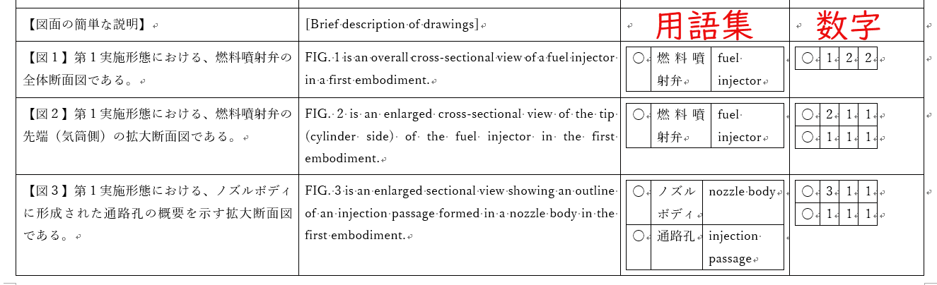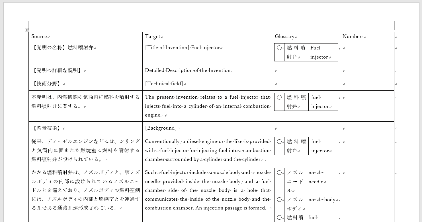 GreenTのダイアログで翻訳したときの用語集と数字チェックの結果と同じ情報を表にしています。