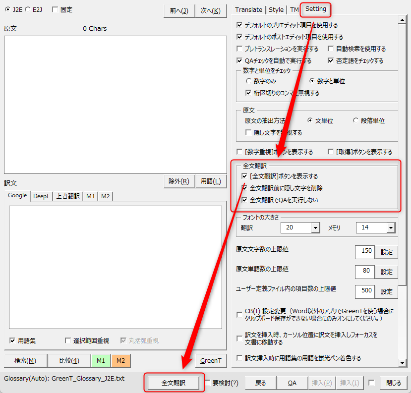 [Setting]タブの[全文翻訳]ボタンを表示するをオンにしてください。