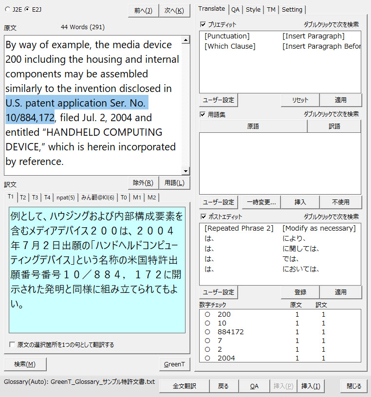 無料のGoogle翻訳と同様に間違った米国特許出願番号が記載されていますが、これはGreenTのQA機能で気がつけます。2文目は文章として成立しています。