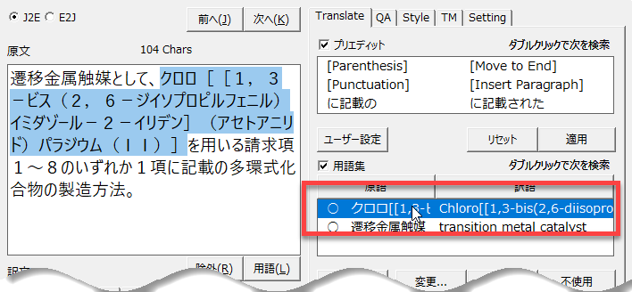 今回は、化合物名が長すぎて正確に訳せていないらしいことが想像がつきますので、「クロロ・・・」を選択します。