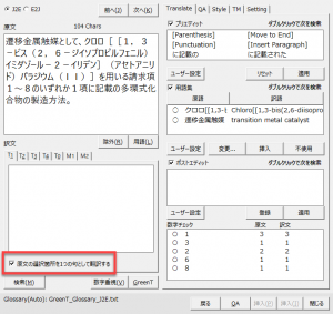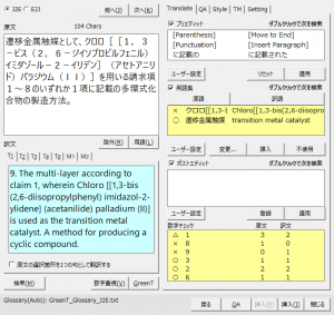 通常の翻訳とこの機能(原文を意味で区切り翻訳する機能)での翻訳と比較します。特許の化学分野の日英翻訳の例を用います。
