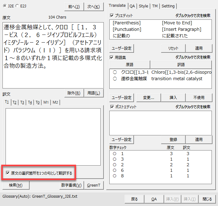 [訳文]欄[T1]タブにある[原文の選択箇所を1つの句として翻訳する]チェックをオンにします。
