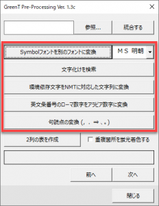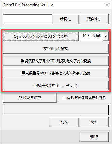 [アドイン]タブの[PP]ボタンで起動する[Pre-Processing]ダイアログの以下の赤枠内の処理は、すべて機械翻訳に適さない文字を自動変換する機能です。