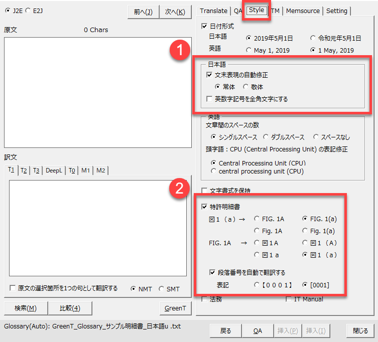 [Style]タブの①の箇所で、英日翻訳では、文体を「常体」に設定します。英数字記号を全角にする場合には、[英数字記号を全角文字にする]をオンにします。