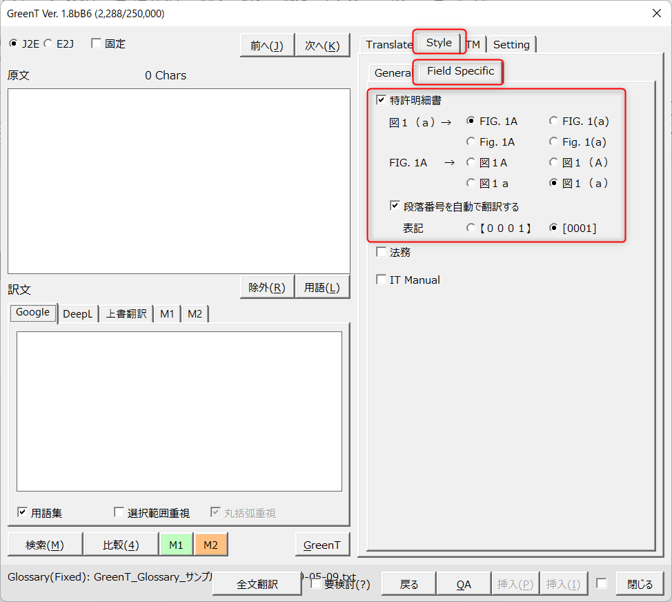 [Style]タブの[Field Specific]タブで、特許翻訳用の自動処理を適用するために、[特許明細書]のチェックをオンにします。クライアント指定のスタイルの項目をオンにします。