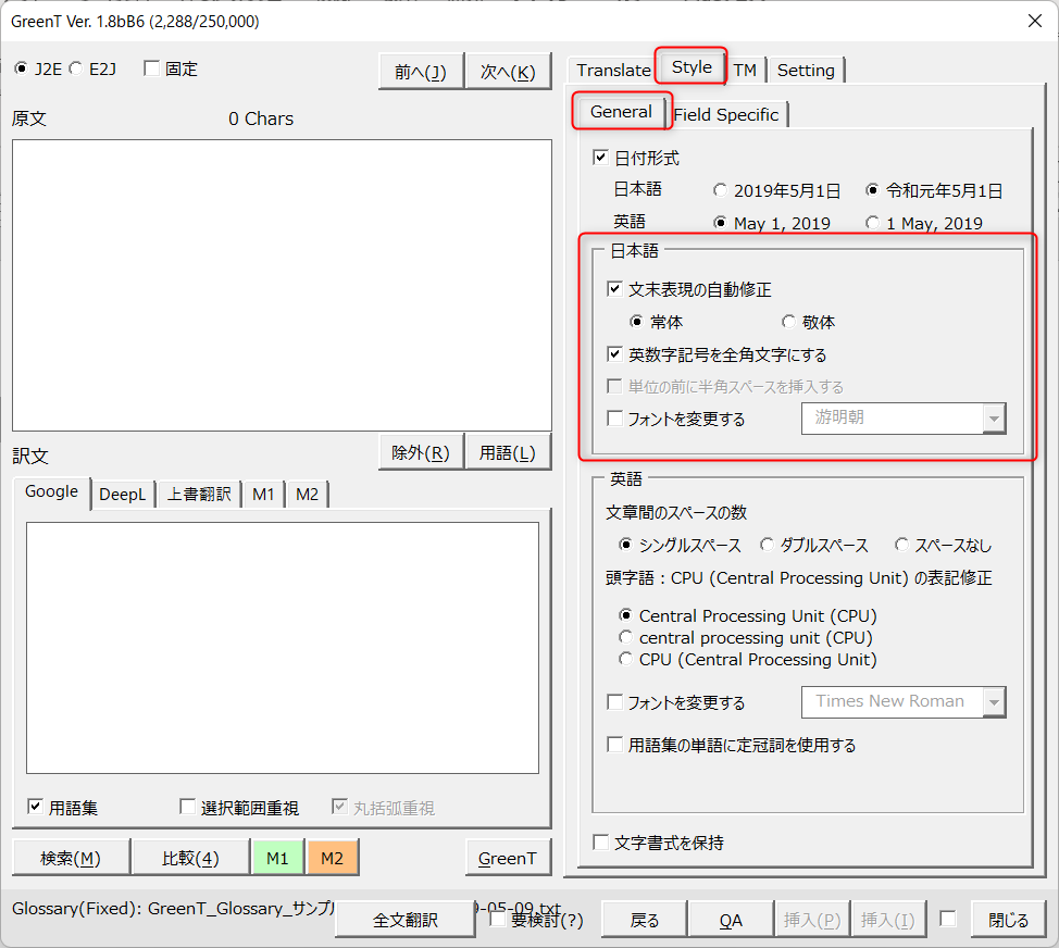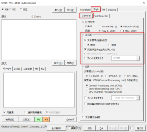[Style]タブの[General]タブで、英日翻訳では、文体を「常体」に設定します。英数字記号を全角にする場合には、[英数字記号を全角文字にする]をオンにします。