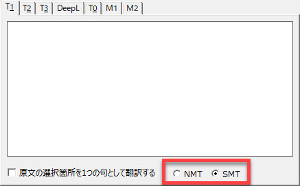 また、それぞれのタブではラジオボタンでニューラル機械翻訳(NMT)と統計機械翻訳(SMT)を切り替えます。好みに応じて使い分けてください。