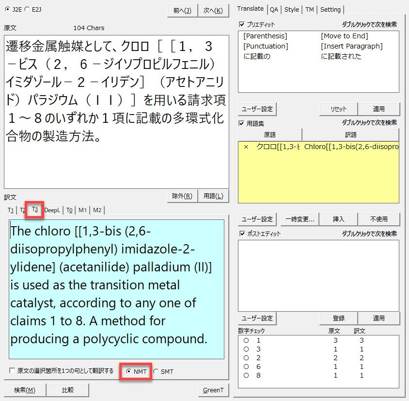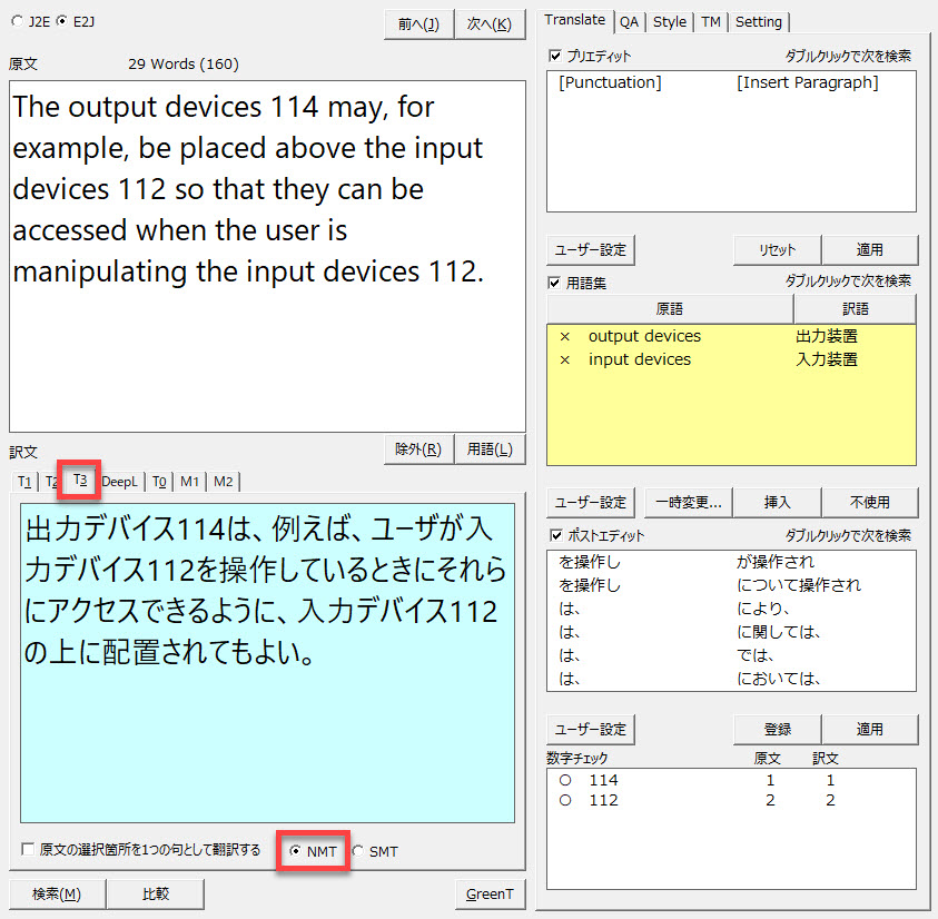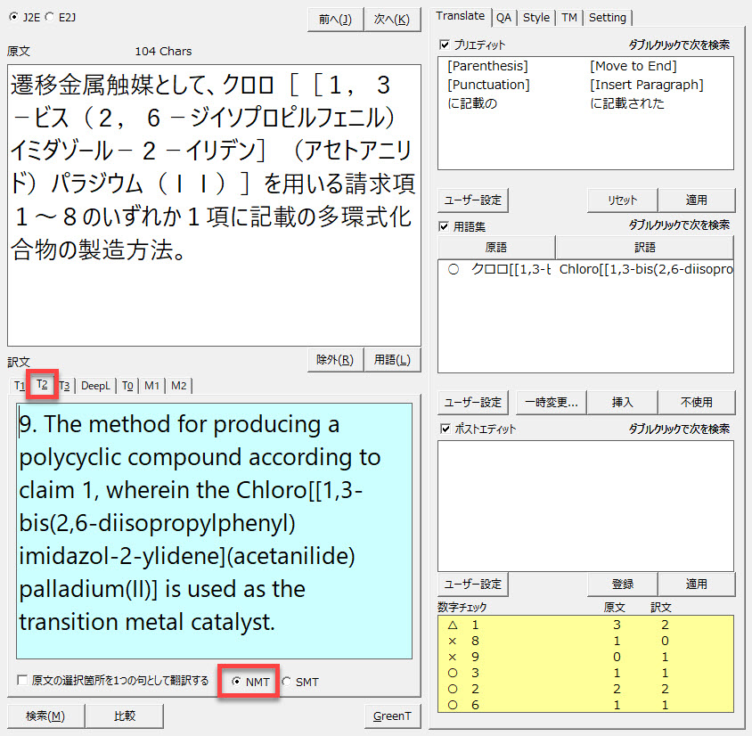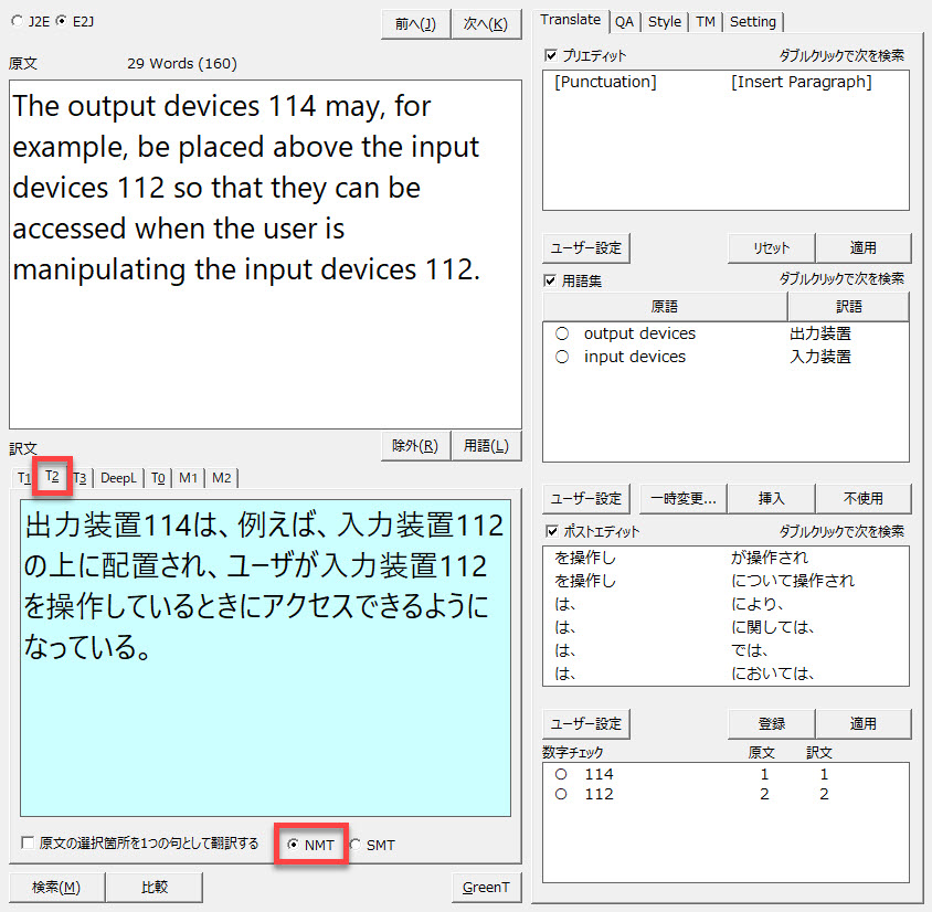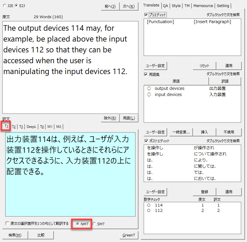 [T1]タブと[T2]タブとは異なる構文になりました。用語が適用されています。数字も正しく訳出されています。