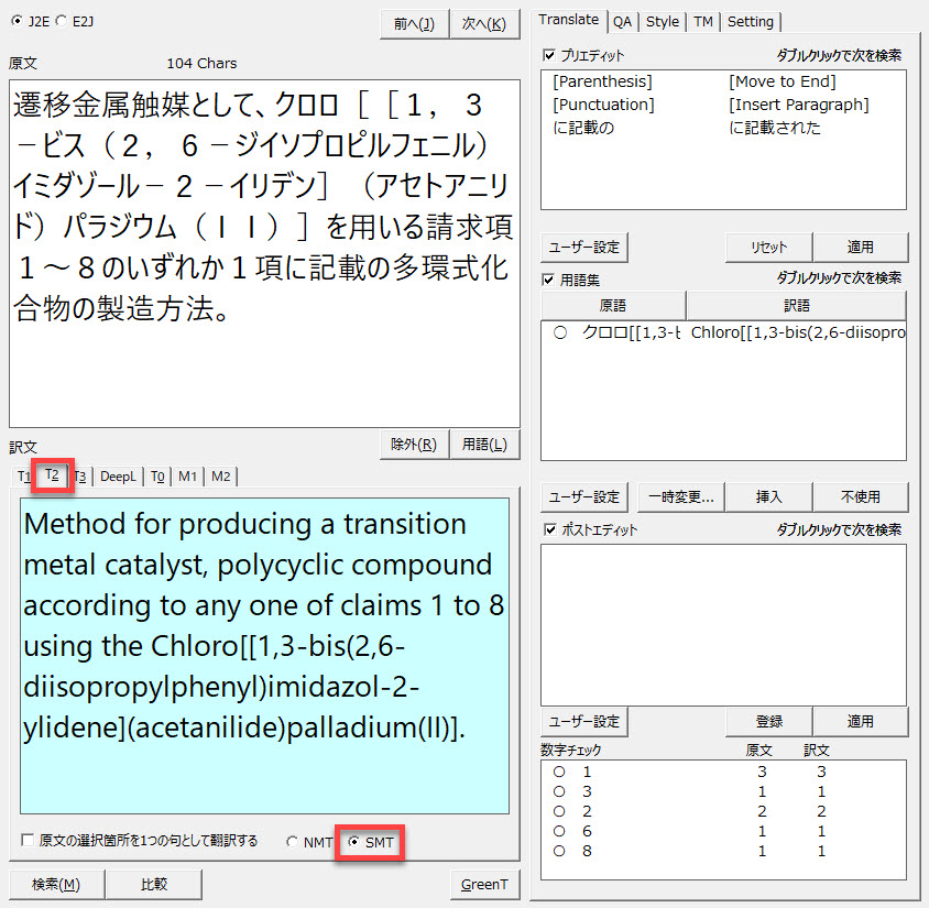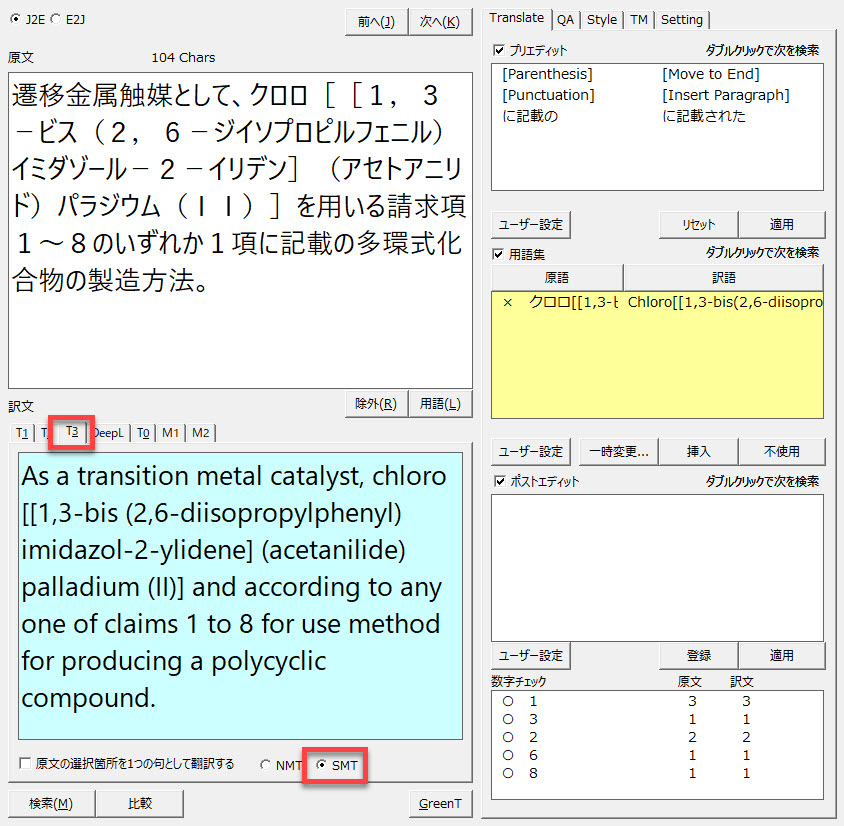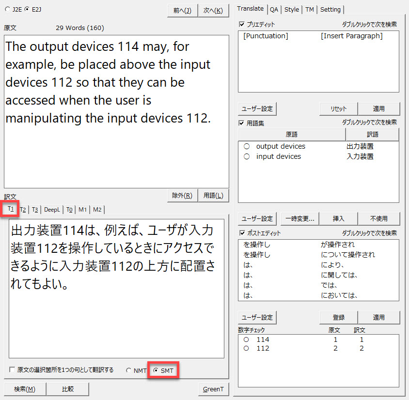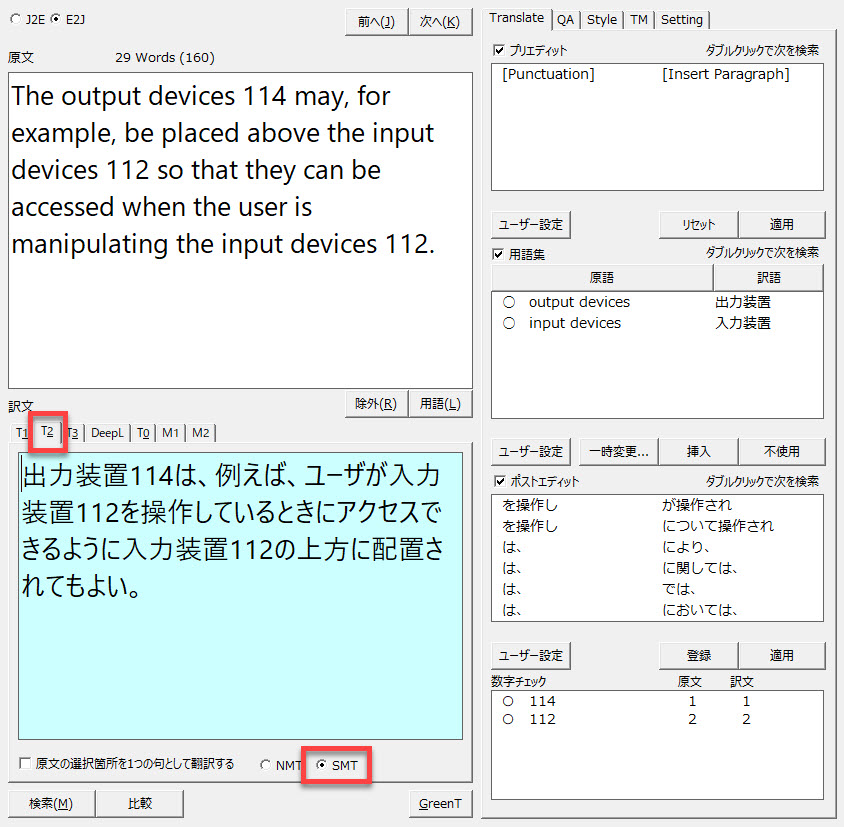 SMTを利用する場合には、[T3]タブにして用語集を適用しないほうが出力結果がよくなることが多いと思います。
