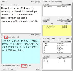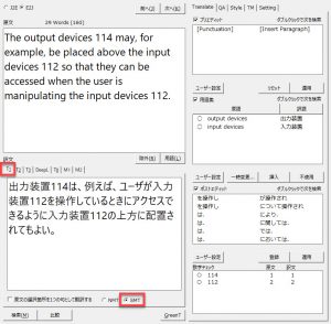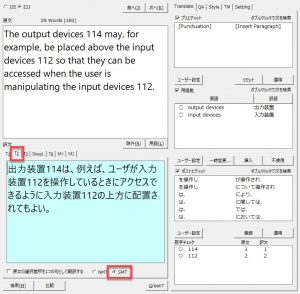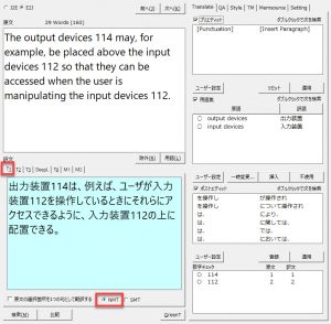 [T2]タブでは用語集を適用することを重視します。文構造がシンプルにな場合には、出力される訳文が[T1]タブよりも自然な表現になることがあります(下記の「出力例2:日英特許翻訳」を参照)。訳語を無理やり当てはめるので係り受けが不自然な訳文が出力されることがあります。