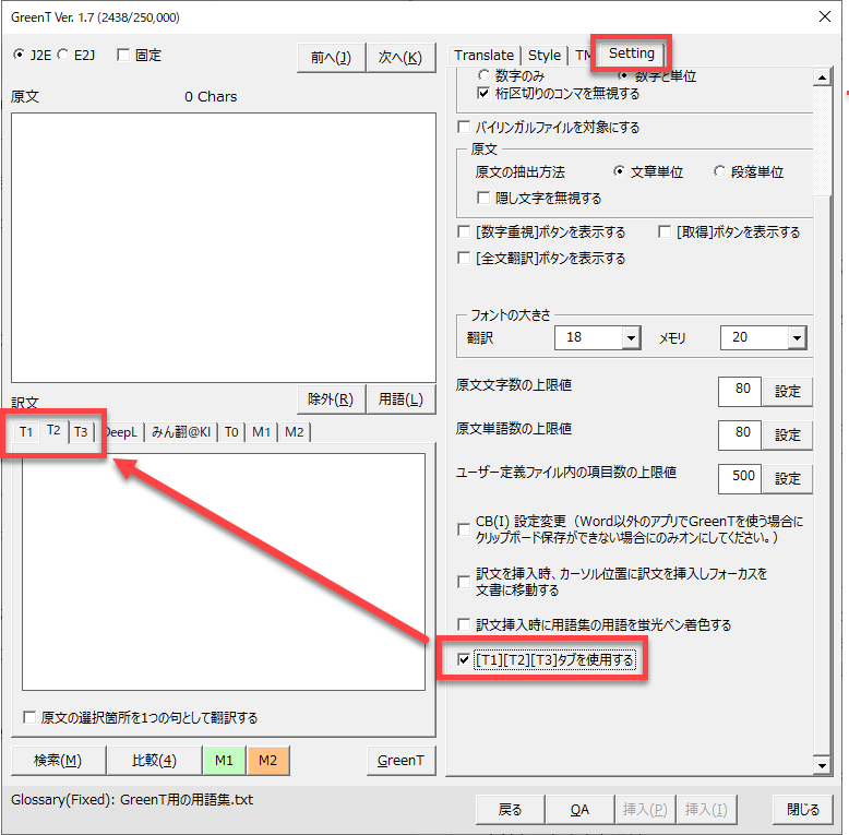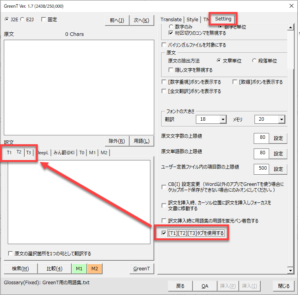 Ver. 1.7(2021年8月公開)以降、[T1][T2][T3]タブを[Google]に統一しました。 用語集を適用する際には、[T2]のアルゴリズムで翻訳をします。 また、SMT(ルールベース機械翻訳)機能を廃止しました。 なお、以下の設定で[T1][T2][T3]タブの表示に戻せます。