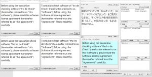 この時に左右の欄に自動的に訳文が表示され、文の差分が蛍光ペンの黄色と赤文字で表示されます。完全に一致する場合にはすべて黒文字になります。