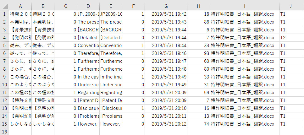 Excelにコピペをすれば、データを並べ替えて分析できます。特に、翻訳作業に時間がかかった文章を特定したり、原文修正をした文章だけを抽出したりする作業はExcelがやりやすいと思います。