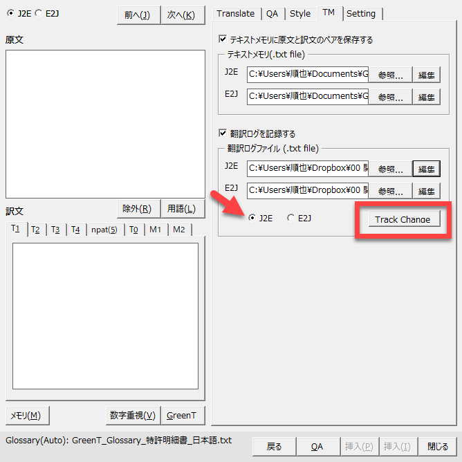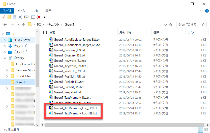 翻訳ログファイルは、デフォルトでは、「Document」フォルダの「GreenT」フォルダ内の以下のファイルに指定されています。