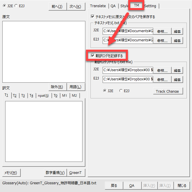 [GreenT]ダイアログの[TM]タブの[翻訳ログを記録する]チェックをオンにします。