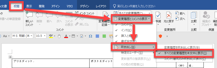 変更箇所を文中に表示する場合には、おなじみの以下のWordの操作をします。