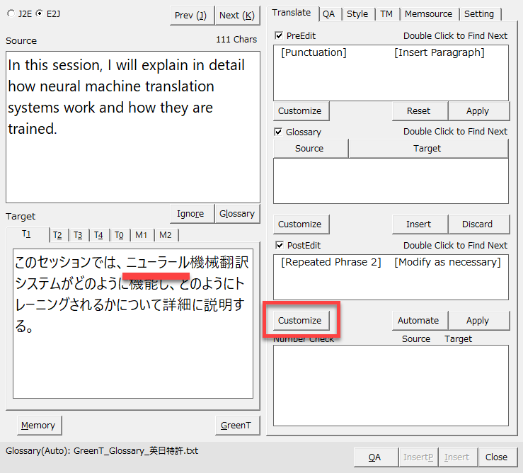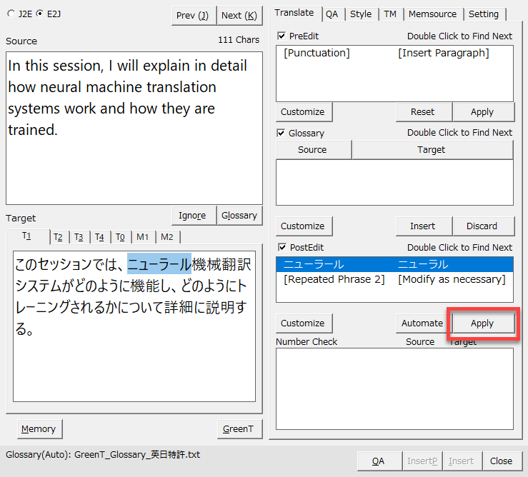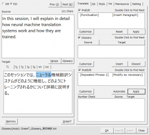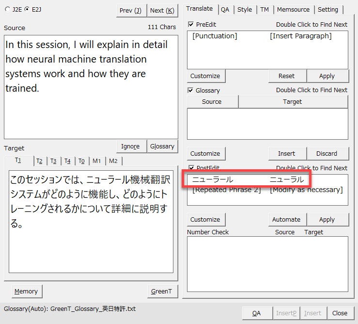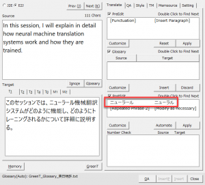 すると、訳文中の「ニューラール」の言葉が「ニューラル」に修正されます。言葉を一つ一つ確認しながら修正する作業にむいています。