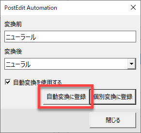 表示される自動化用の設定ダイアログで、[自動変換に登録]ボタンをクリックします。