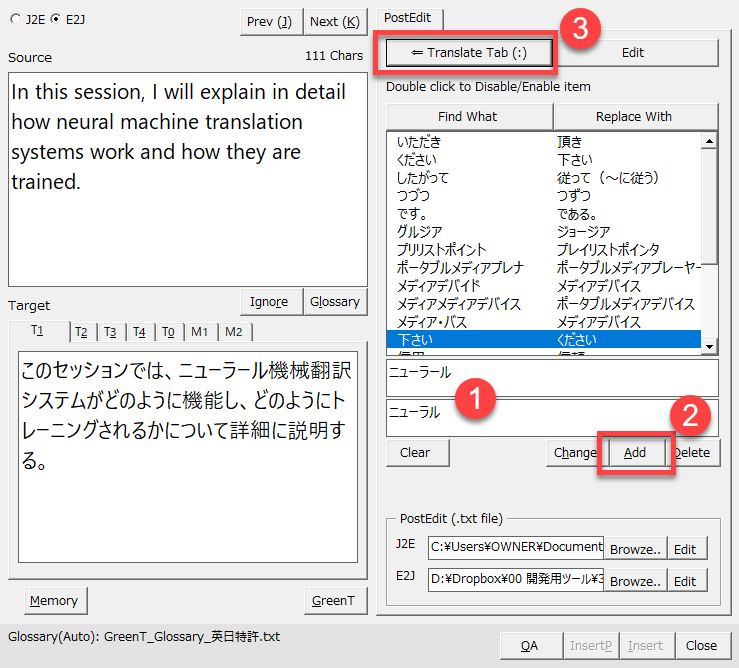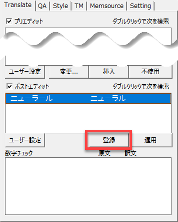 今回は「ニューラール」と「ニューラル」とを以下のように登録して[⇐Translate Tab]ボタンで元の表示に戻ります。