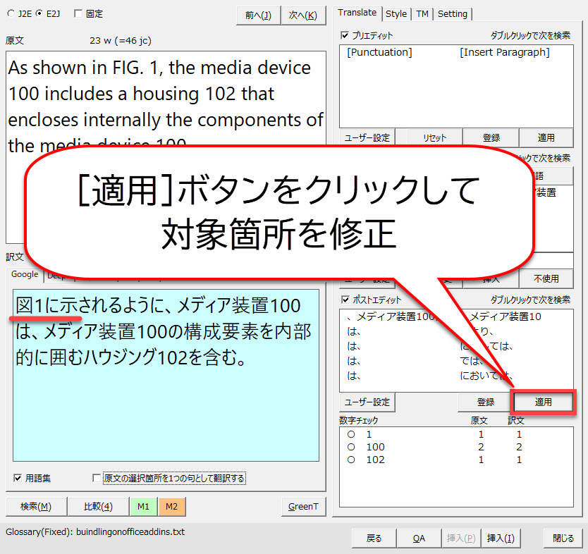項目をクリックすると対象箇所が選択されますので、[適用]ボタンで変換してください。