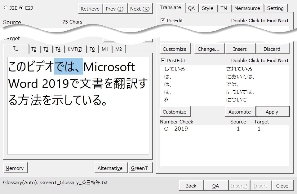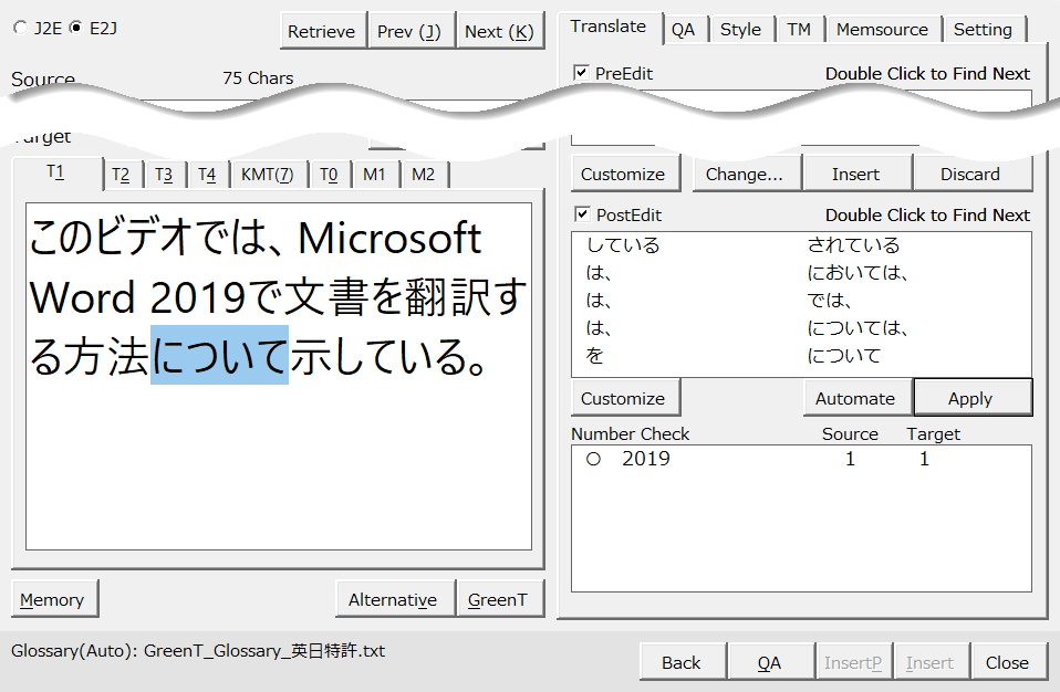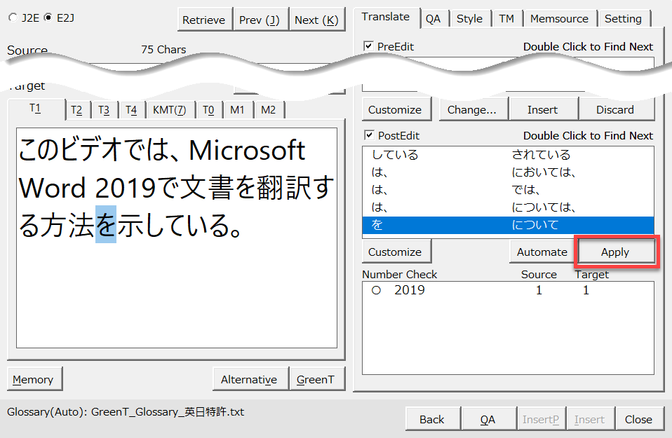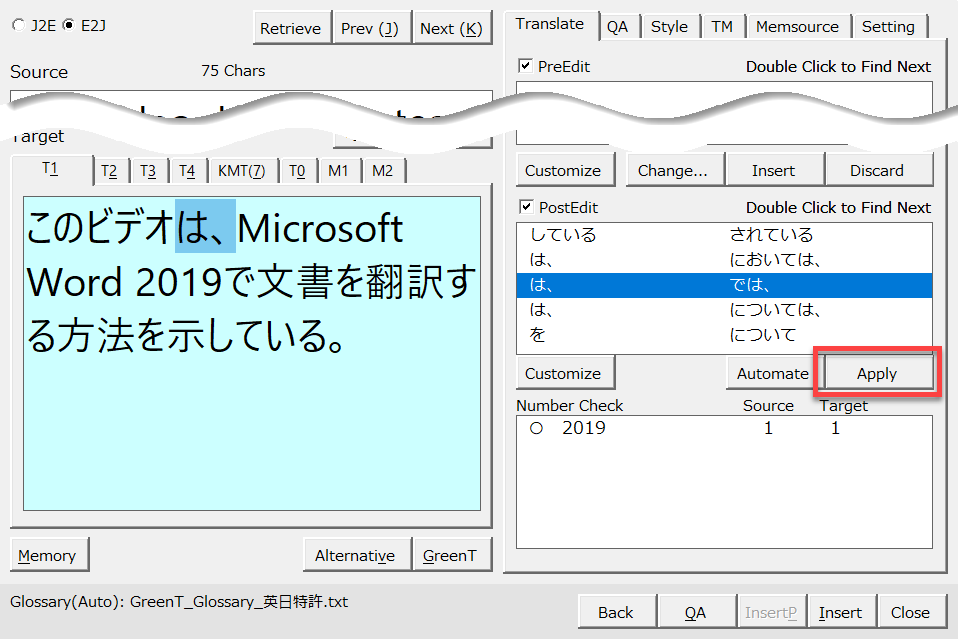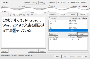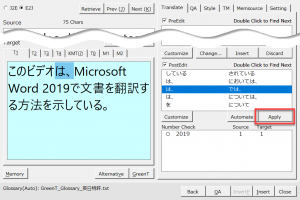 PostEdit欄の「は、→では、」の項目をクリックしてTarget欄の「は、」を選択します。[Apply]ボタンをクリックして「では、」に変換します。