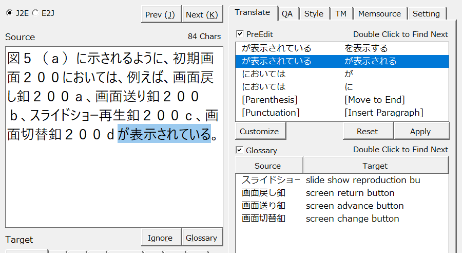 GreenTのプリエディット機能を適切に利用すると出力する訳文が変わります。効果的なプリエディットについては、ユーザー定義ファイルに登録をしておけば次回以降はクリック操作だけで使えるようになります。特許明細書を例に説明します。