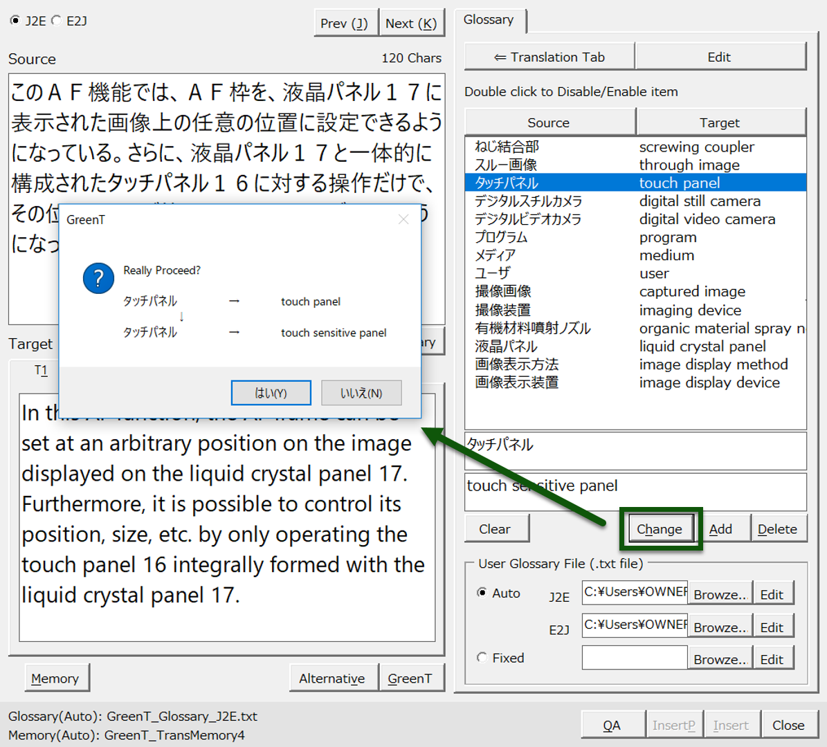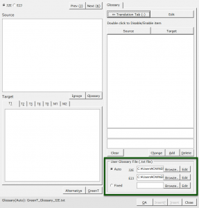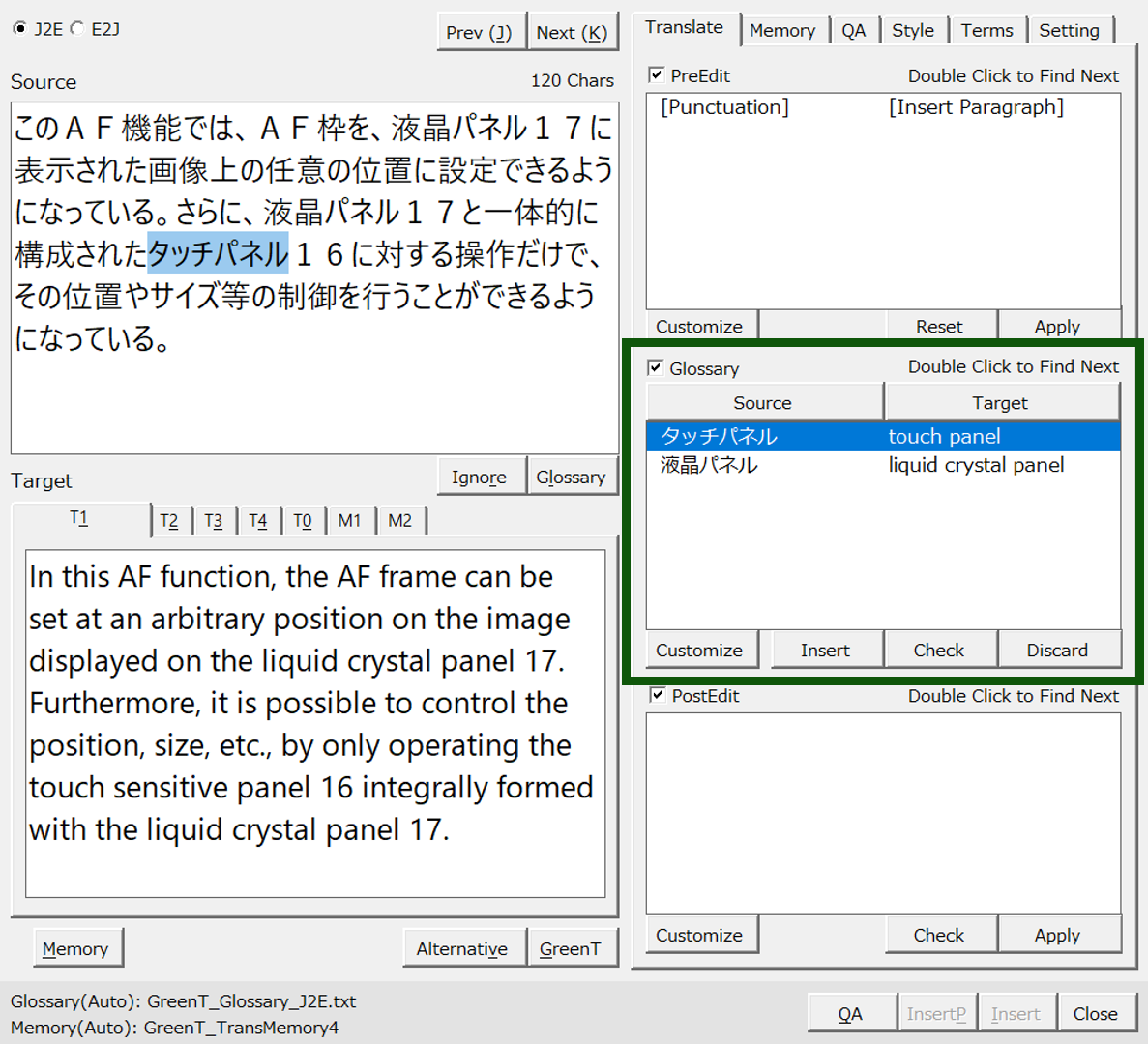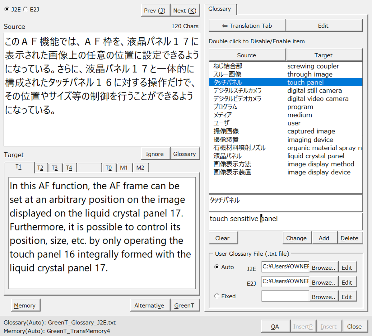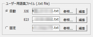自動(Auto)の場合、J2Eに日英翻訳の用語集、E2Jに英日翻訳の用語集を設定します。原文(Source)欄に入力されている文字の言語を判定して使用する用語集が自動的に切り替えられます。