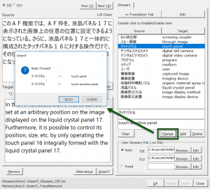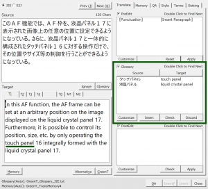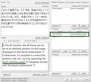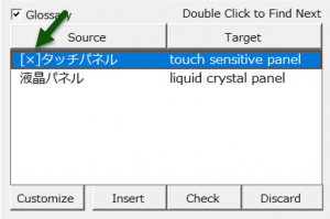 用語集の項目をクリックすると原文(Source欄)で対象となる文字列が選択されます。どの部分で使われているのか確認できます。訳文(Target欄)での使用箇所は目視で確認します。