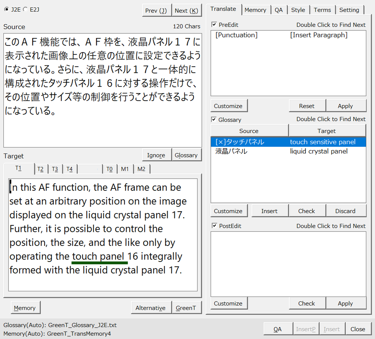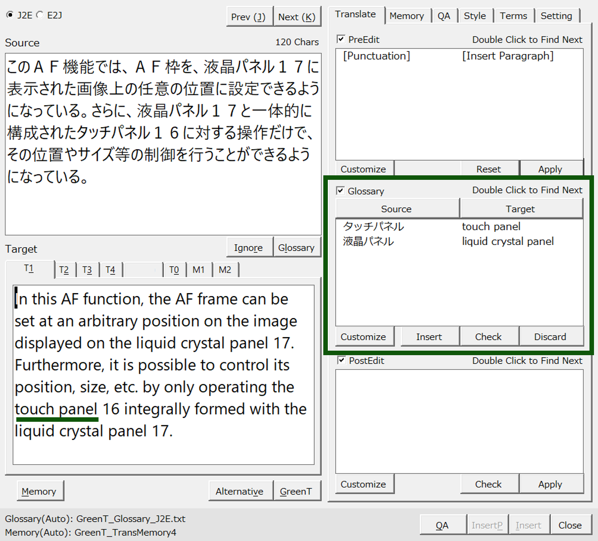 GreenTでは、用語集の訳語が訳文に適用されるように独自処理をしていますが、使用する翻訳エンジンによっては正確に反映されない場合がありますのでご注意ください。用語が適用状況はQAチェックにより確認できます。