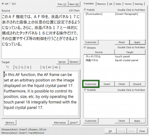 対象となる文章ではなく、ファイル全体で特定の訳語を使用しない場合は、編集画面で設定します。[Customize]ボタンをクリックして用語集の編集画面を開きます。
