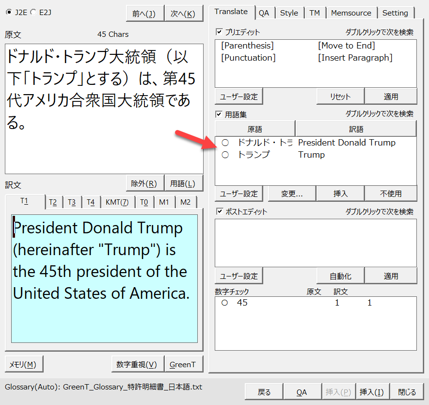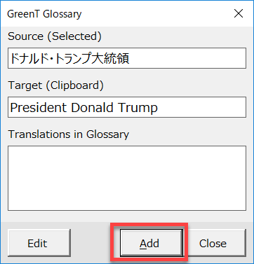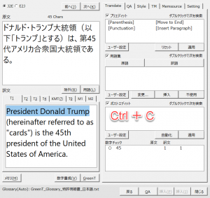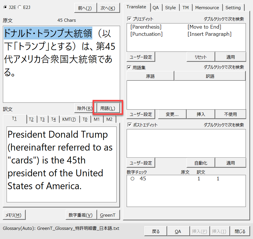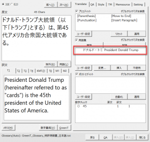 次に、原文で原語にあたる「ドナルド・トランプ大統領」を選択して、[用語]ボタン(英語表示では[Glossary]ボタン)をクリックします。