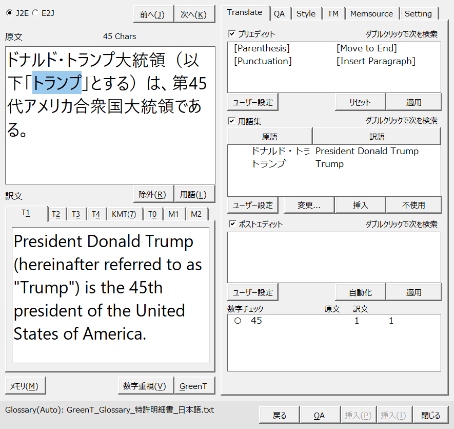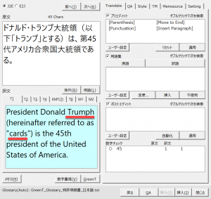 この状態で訳文を出力してみます。[GreenT]ボタンをクリックします。以下のように誤訳のない英文が出力されました。